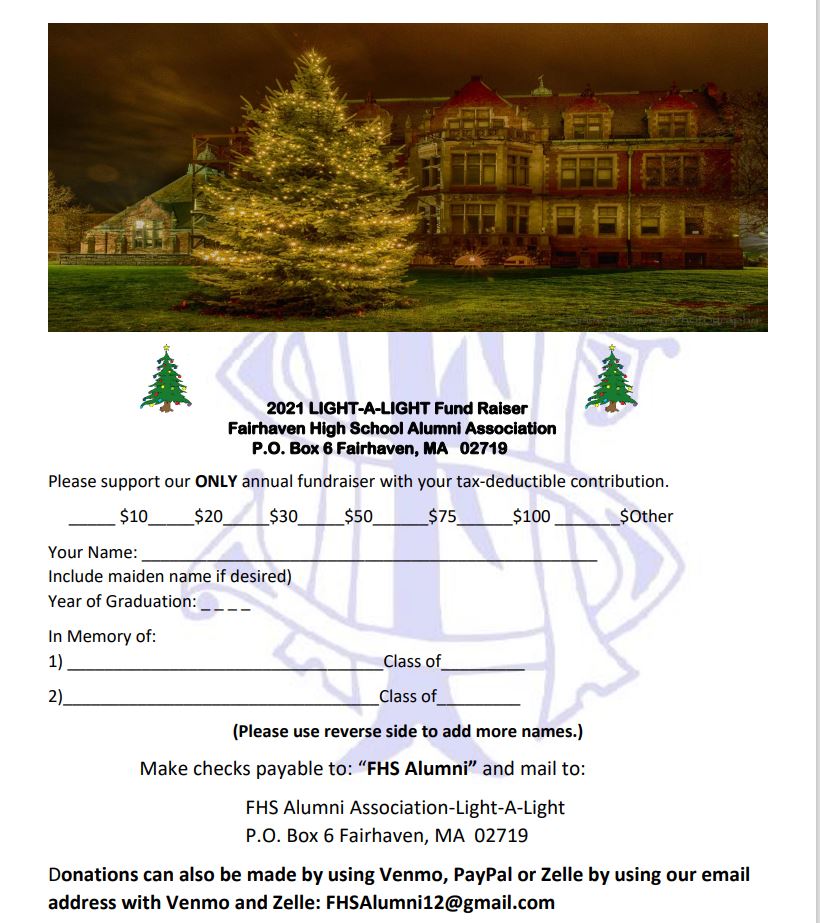 Download/Copy Light-A-Light Form.Mail to FHS Alumni PO Box 6 Fairhaven Ma. 02790
