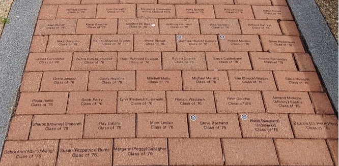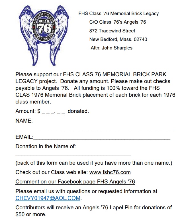 Angels "76 successfully raised the necessary funds to put into the Memorial Brick Park the 46 deceased members of our class. Creating the largest memorial to date towards any one FHS graduating class. Currently raising funds to place ALL members of our class into the Memorial Park thus, creating a lasting memorial to the CLASS of 1976. You can assist by donating using this form. Send to Angels 76 C/O 872 Tradewind Street, New Bedford, Mass. 02740