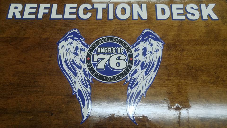 Angels 76 obtained an old school desk from Fairhaven High school, John spent a summer refurbishing the desk and now uses it as a show piece for our fund raising events. Envelopes for donations are inside the desk along with a Class 1976 year book. Reflecting on our class"s past, our class"s future.
