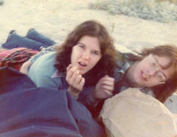 Sue, Jane, Jackie, Sandra and Peter (G.) somewhere on the beach around 1975? Jane doing a balancing act as Peter takes a dive...