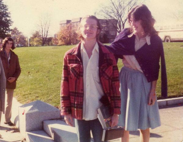 Peter (G.) and Sandra in the front steps of FHS and Sandra running loose (& barefoot) in the streets of Fairhaven.